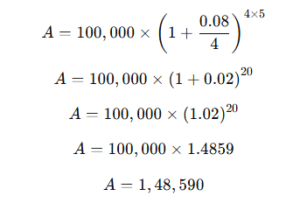 Let’s say you invest Rs. 1,00,000 in a fixed deposit for 5 years at an annual interest rate of 8%, compounded quarterly.