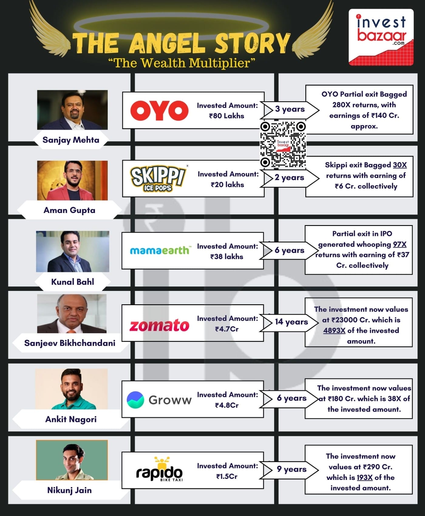 The startup world is an ecosystem for innovation, with the potential to revolutionize industries and change the way we live. But these young companies with new business models often need funding in their early stages – that’s where angel investors come in. Imagine turning a ₹80 lakh bet into a cool ₹140 crore! That’s the kind of magic Sanjay Mehta has achieved by investing in OYO, the hospitality giant – who revolutionized budget accommodations worldwide, his partial exit from this venture fetched him an astonishing 280X return. Looking beyond Mehta, we have Aman Gupta, a judge on the popular reality show Shark Tank India. In just two short years, his ₹20 lakh investment in the ice popsicle brand “Skippi” turned into a whopping ₹6 crore, translating to a 30X return! These stories exemplify the power of spotting a hidden gem and the potential of wins in the startup world.